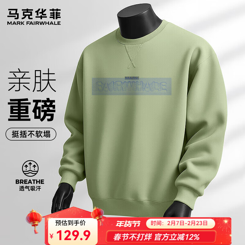 马克华菲春秋季长袖圆领卫衣男潮流印花宽松透气休闲运动日常外穿百搭上衣 【重磅棉】- 豆绿#PMK波纹马克 2XL