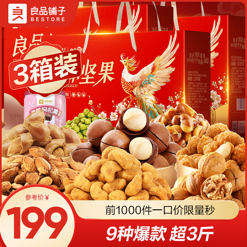 良品铺子2026年货坚果零食礼盒大礼包高档春节过年送礼长辈零食 【超值3盒】坚果礼1576g/10袋*3盒 -