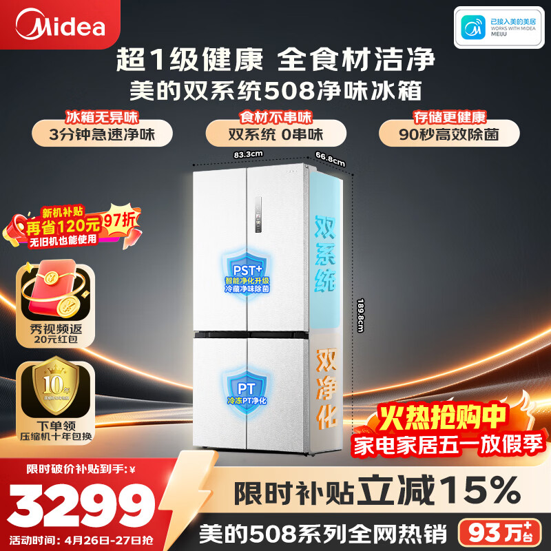美的(Midea)508L十字门冰箱双系统双循环除菌净味大容量一级能效风冷无霜以旧换新白BCD-508WSPZM(E)国家补贴
