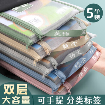 慢作双层学生文件袋科目分类文件袋A4透明网纱手提书袋多层分科书本试卷收纳袋学科分类袋拉链作业袋 【双层5个】语数英+综+作(男生款)
