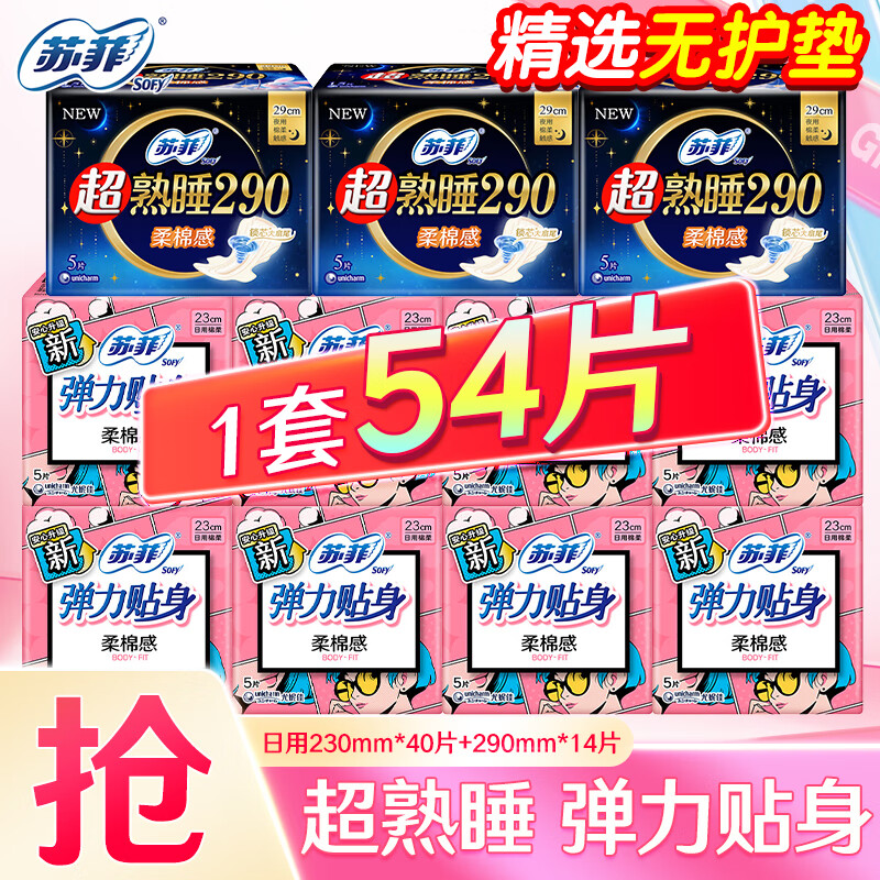 苏菲 卫生巾日夜用组合290超长日用230防漏姨妈巾护垫整箱批发尤妮佳 精选超值日夜54片(无护垫)