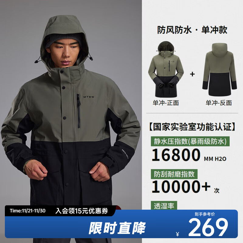美特斯邦威(Meters Bonwe)【华夏之壳-林系列】三防冲锋衣男款25年春季新款户外情侣登山服 竹影绿/玄影黑(加摇粒绒内胆) L (175)