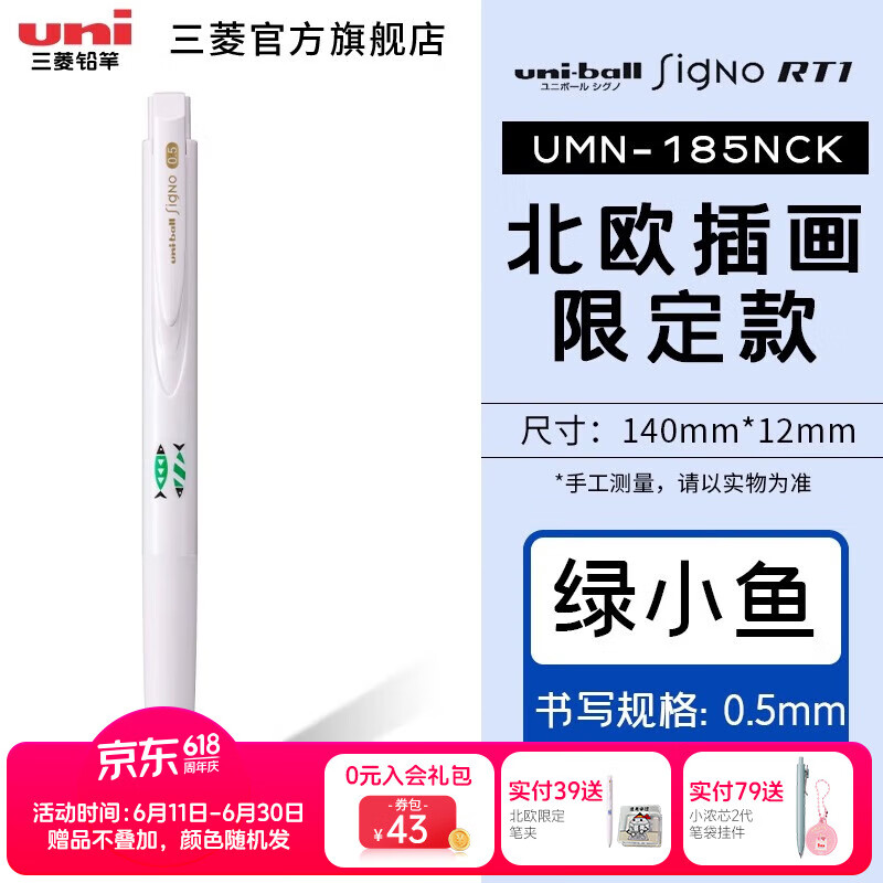 uni三菱中性笔UMN-185NCK北欧插画限定按动式考试专用刷题办公黑色笔低阻尼顺滑高颜值笔0.5mm 绿小鱼-蓝色 0.5mm