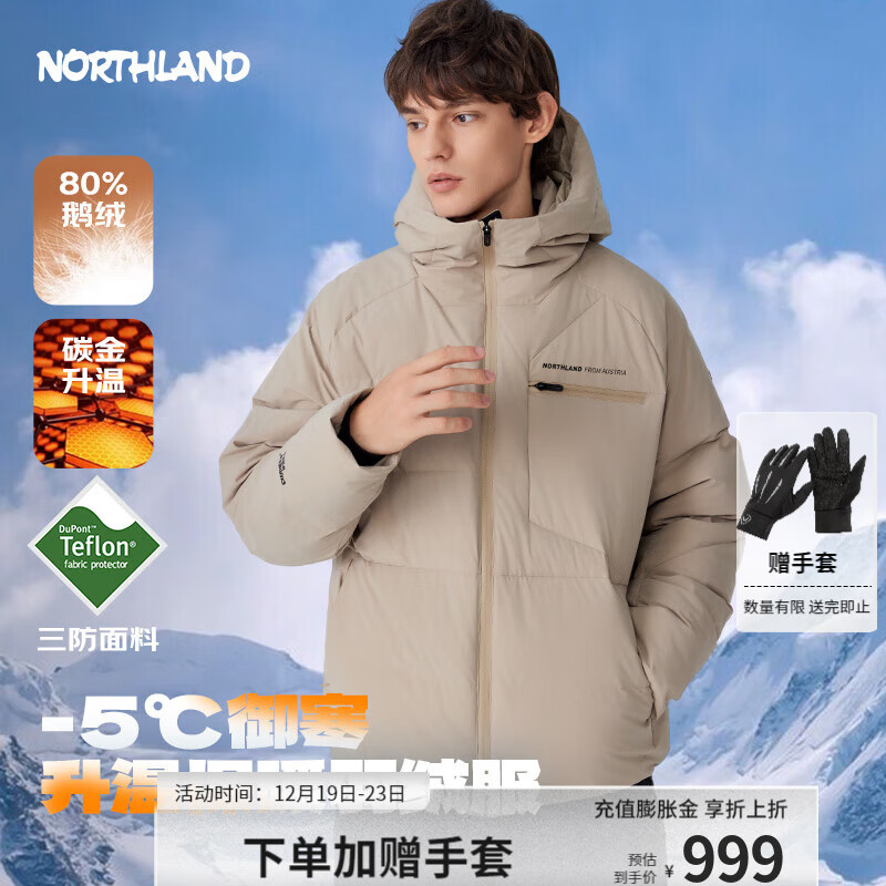诺诗兰(NORTHLAND)羽绒服秋冬新款鹅绒面包服抗寒保暖情侣可升温鹅绒羽绒外套连帽 悬崖卡其色 XL (170) 100-120斤 卡码拍小