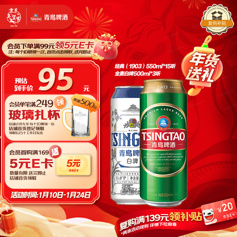青岛啤酒(TsingTao)经典(1903)550ml*15+精酿白啤500ml*3组合装共18罐 年货送礼