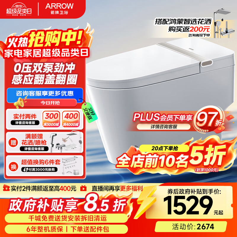 箭牌(ARROW)L3P轻智能马桶0水压合盖冲感应翻盖智能坐便器AKE1169-AL 400坑距