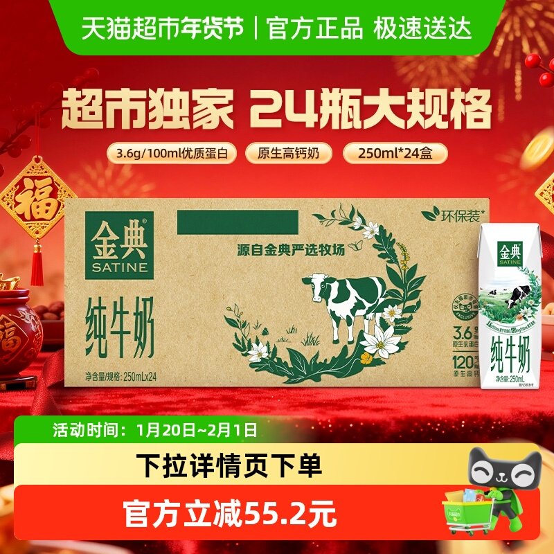 伊利金典纯牛奶250ml*24盒整箱3.6g蛋白学生家庭早餐囤货环保装