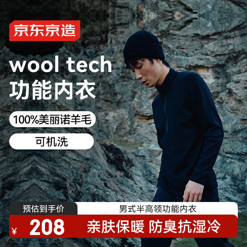 京东京造羊毛速干衣T恤男户外运动徒步登山长袖保暖内衣 半襟拉链黑色L