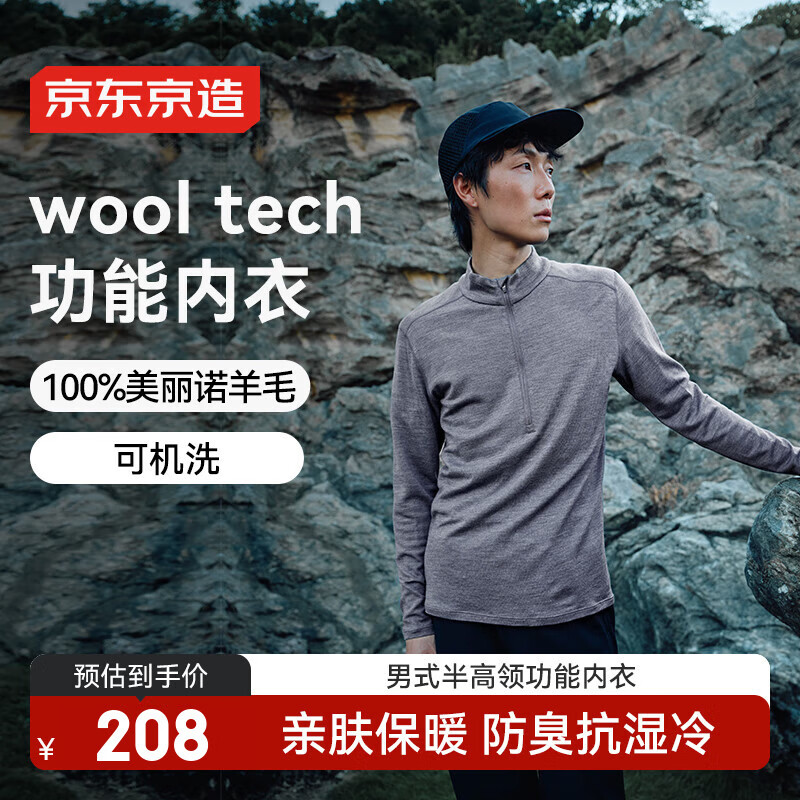 京东京造羊毛速干衣T恤男户外运动徒步登山长袖保暖内衣 半襟拉链花灰 2XL