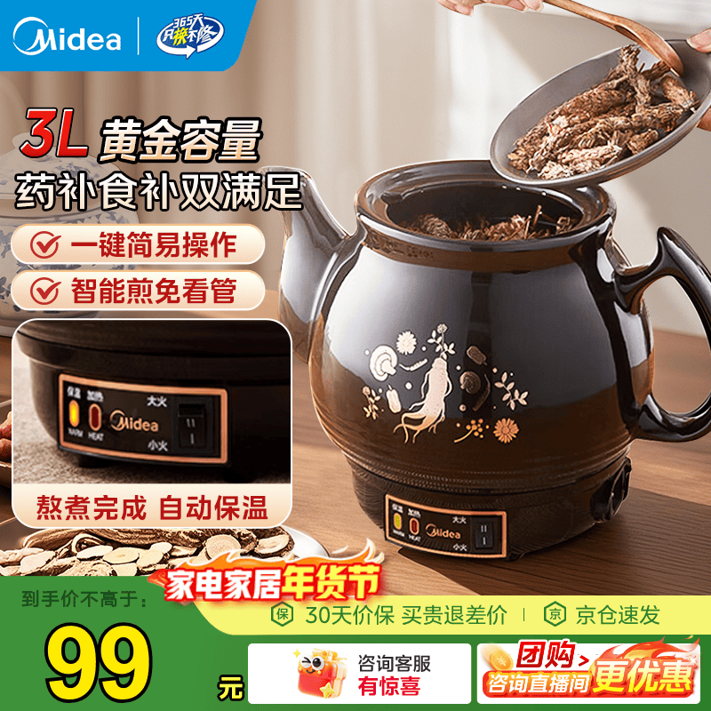 美的(Midea)中药锅煎药壶 智能全自动陶电砂锅炖药锅煲 养生壶中药罐中药壶煮药壶熬药壶一体式【国家补贴】 【智能免看管】MD-DG30E103 3L