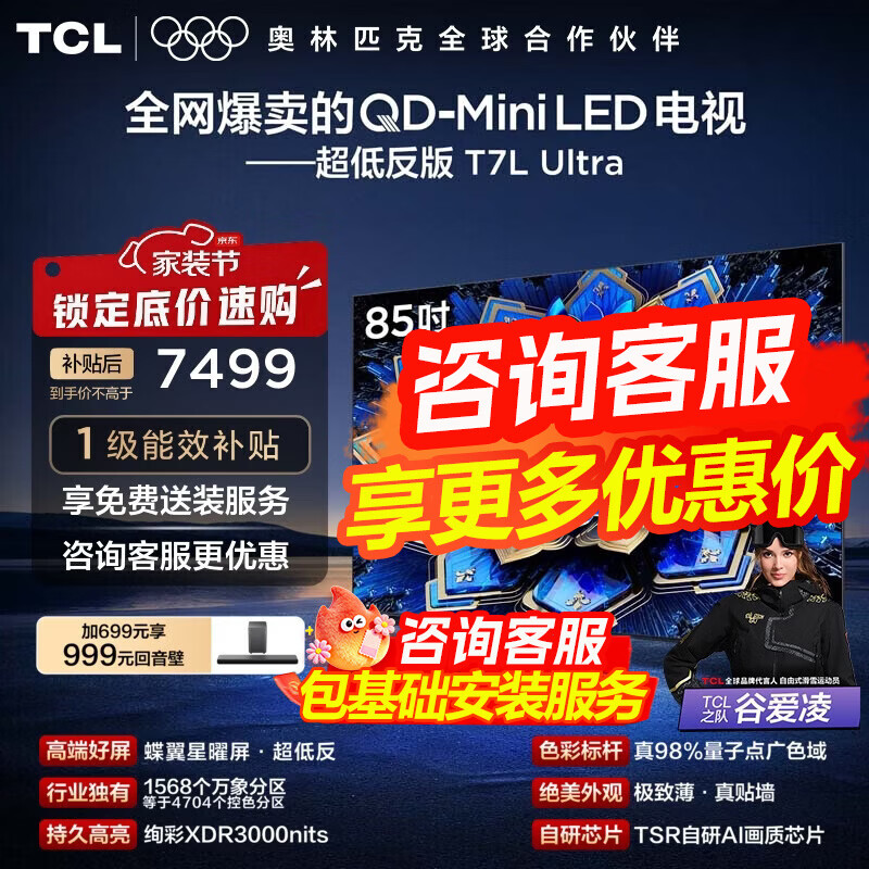TCL电视 85T7L Ultra 85英寸电视 QD-Mini LED 蝶翼星曜屏 万象分区 绚彩XDR 3000nits电视机国家补贴 85英寸