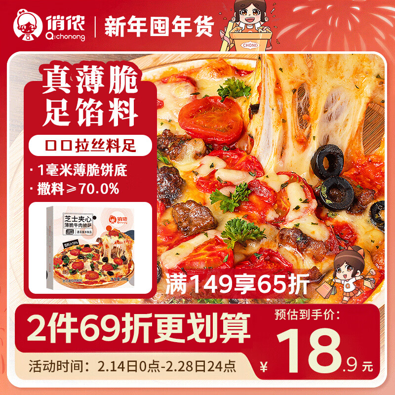 俏侬 芝心薄脆意式牛肉披萨280g/盒 8英寸 番茄肉酱半成品披萨 囤年货