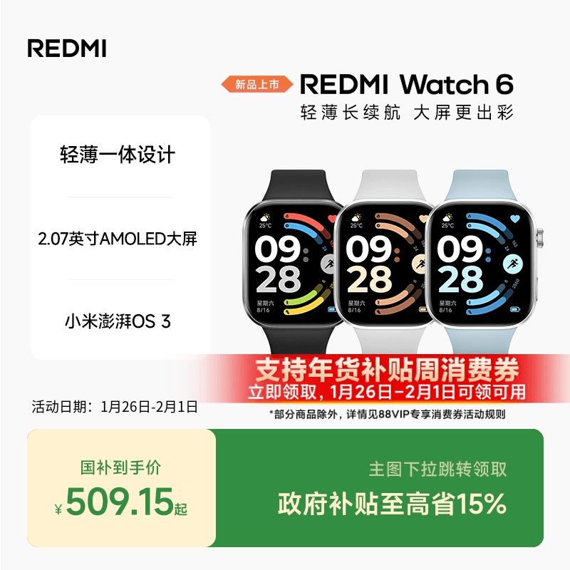红米手表6 REDMI Watch6 小米智能手表运动跑步长续航蓝牙通话血氧心率高清大屏红米手表5升级款