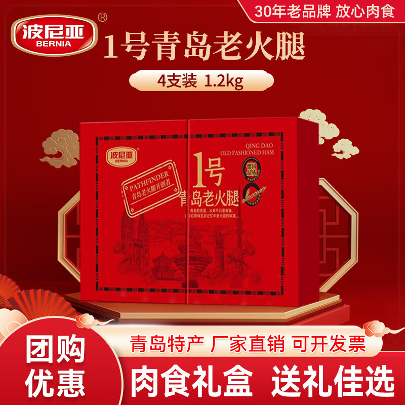 波尼亚(BERNIA)1号青岛老火腿腱子肉火腿 山东青岛特产熏烤大火腿肉肠下酒菜即食 经典味道-1号老火腿伴手礼300g*4