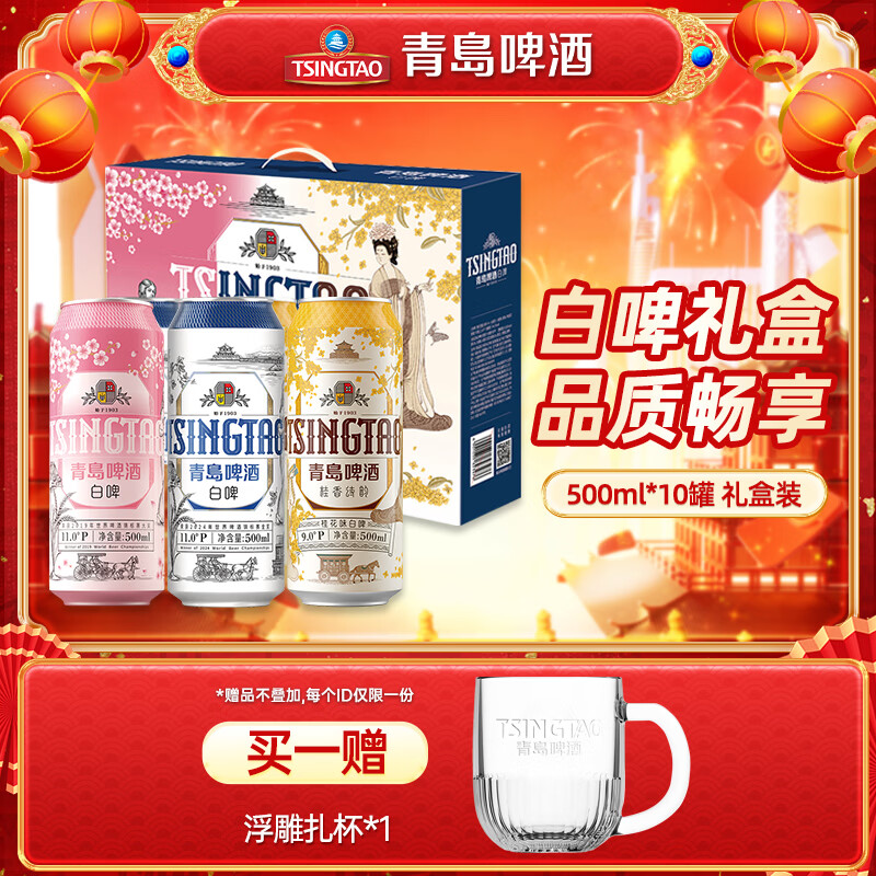 青岛啤酒(TsingTao)白啤酒礼盒500ml10罐佳节送礼(白啤4罐+樱花味3罐+桂花味3罐) 礼盒装