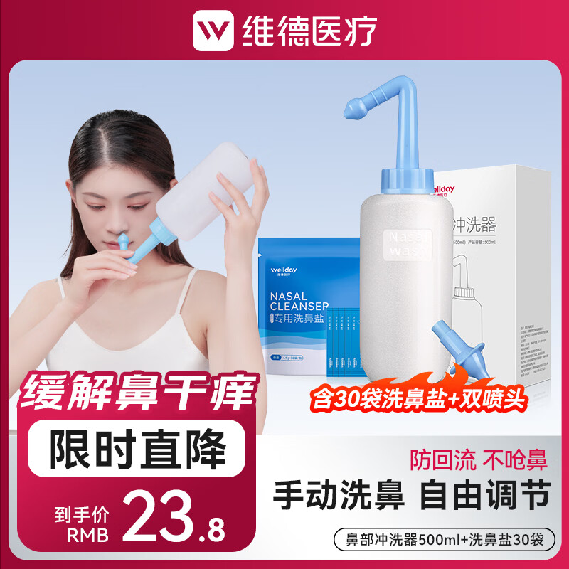 维德(WELLDAY)洗鼻器儿童成人生理盐水手动洗鼻腔清洗器鼻炎喷剂非电动洗鼻器壶 手动洗鼻器500ml+洗鼻盐30袋+双洗鼻头