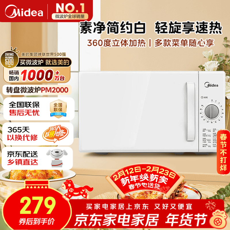 美的(Midea)快捷家用微波炉家用小型迷你360°转盘加热 旋钮操控易洁内胆时间调节20升(PM2000)
