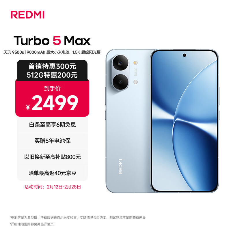 小米(MI)REDMI Turbo 5 Max 天玑9500s 9000mAh大电池 1.5K阳光屏 12+512 海风蓝 小米红米5G手机
