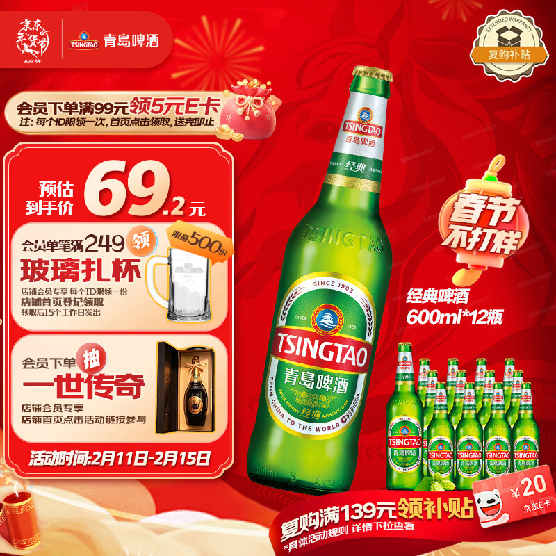青岛啤酒(TsingTao)经典啤酒 600ml*12瓶 升级大容量 整箱装