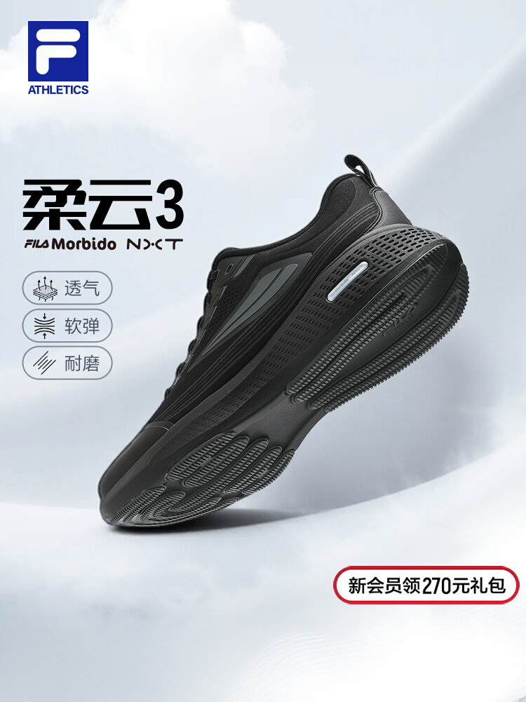 柔云3|FILA斐乐跑步鞋男鞋黑色透气运动鞋子回弹慢网面跑鞋缓震