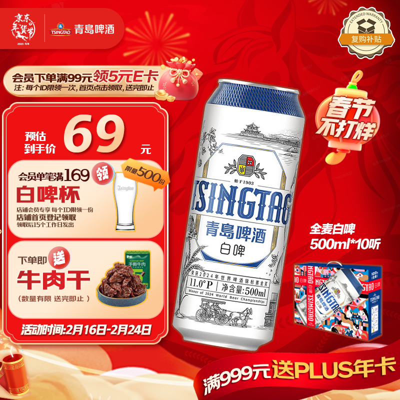 青岛啤酒(TsingTao)全麦白啤 精酿白啤 500ml*10听 礼盒装 佳节送礼