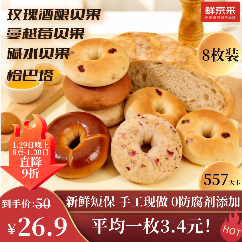 鲜京采健康贝果恰巴塔早餐面包零食碱水蔓越莓玫瑰酒酿8枚代餐760g