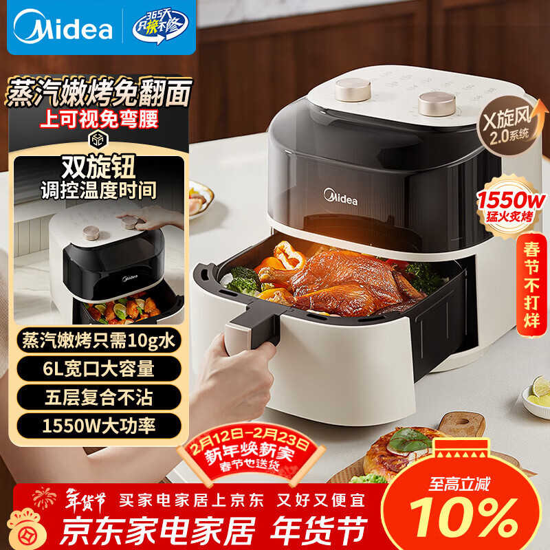 美的(Midea)空气炸锅家用6L大容量双调控免翻面蒸汽嫩烤 2025新款蒸烤一体X旋风 金属包边内腔自营KZE6019年货