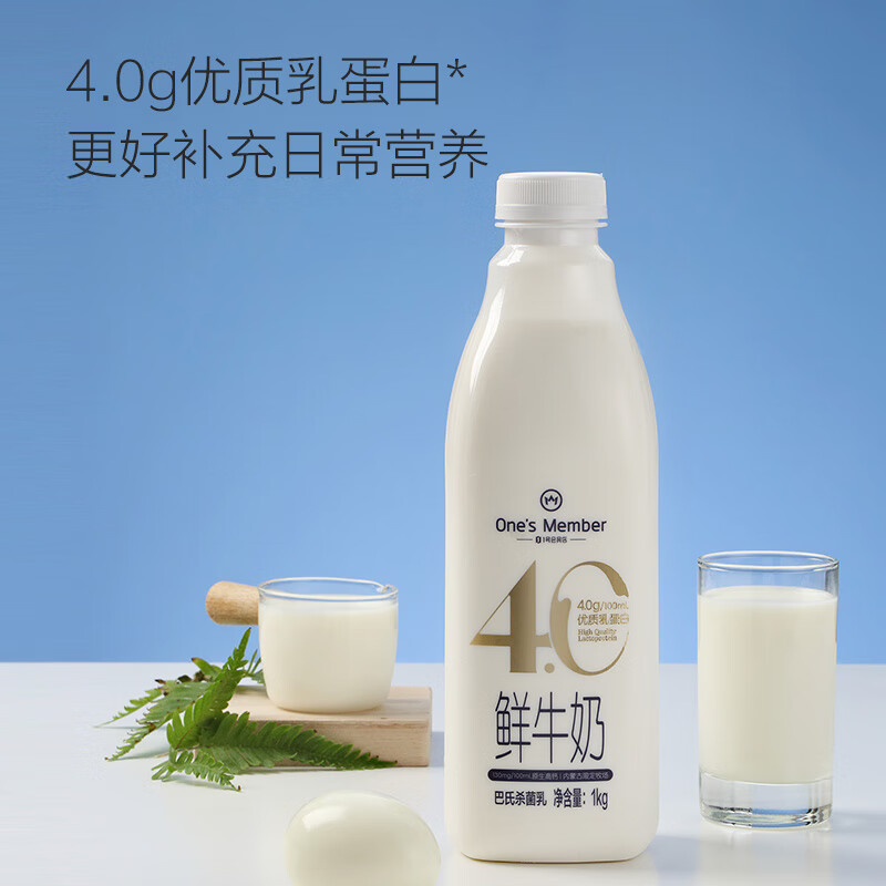 1号会员店(One’s Member)4.0g乳蛋白鲜牛奶1kg*2瓶 限定牧场高品质鲜奶 130mg原生高钙