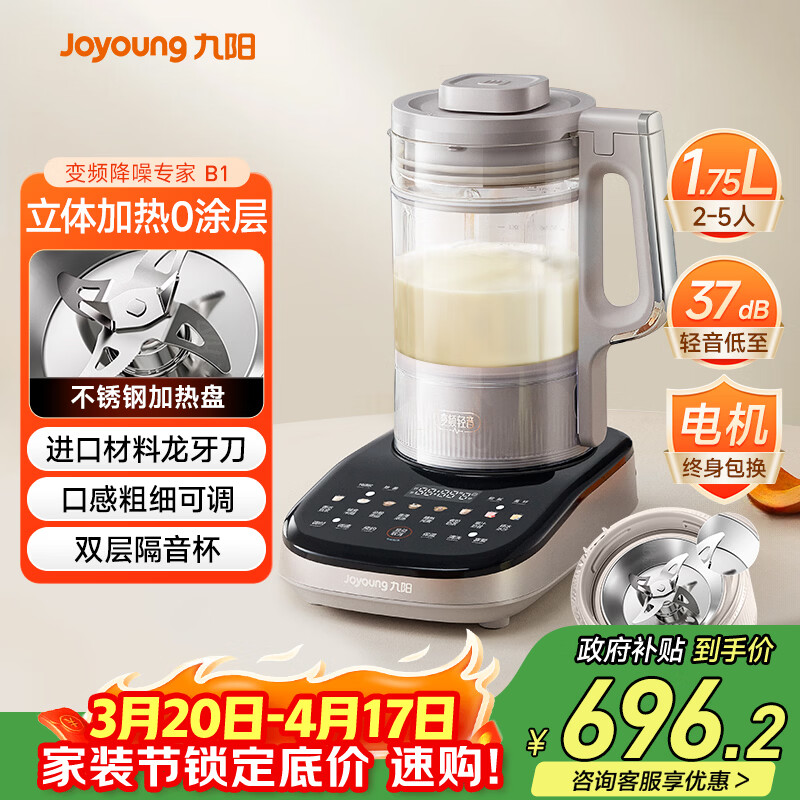 九阳变频0涂层破壁机轻音家用全自动榨汁豆浆机料理机1.75L五谷杂粮3-5人用触控彩屏 B1 国家补贴