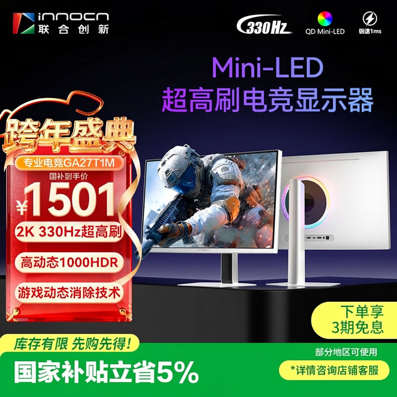 联合创新27英寸2K330Hz 1152分区QD-MiniLED HDR1000 MPCS技术 升降旋转 内置音响电竞显示器GA27T1M白曜