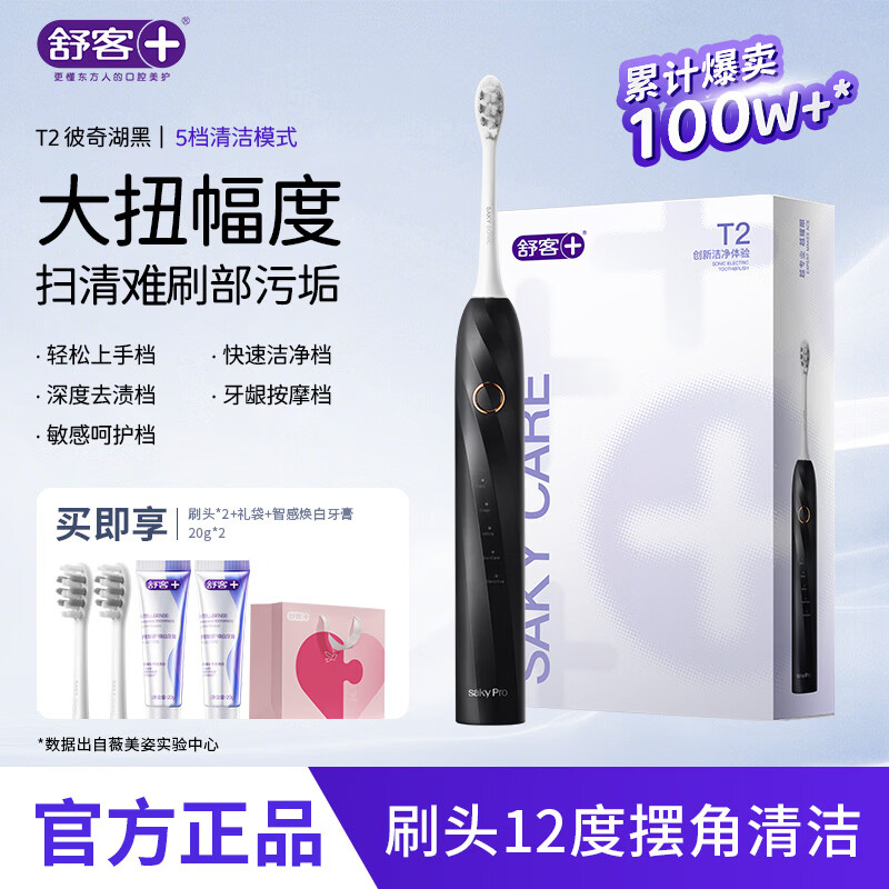 舒客【生日礼物】【新手入门】声波电动牙刷T2 软毛成人充电自动式学生男女情侣套装礼物 高性价比 【爱心礼袋】T2彼奇湖黑(2个刷头+牙膏40g)
