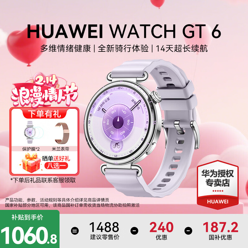 华为(HUAWEI)【情人节礼物】WATCH GT 6智能手表运动玄玑感知血氧心率体温呼吸监测蓝牙通话防水男女健康情绪 41mm 流光紫-氟橡胶表带【送米兰表带+贴膜】