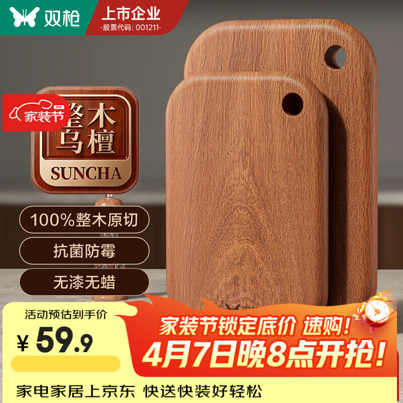 双枪(Suncha) 乌檀木整木菜板家用抗菌防霉小案板实木切菜板婴儿砧板辅食板 【适用2-3人】中号34*22*2.2cm(整木加厚)