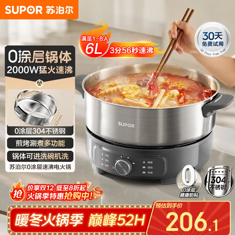 苏泊尔(SUPOR)0涂层不锈钢电火锅 分体电煮锅 火锅专用锅 家用多功能电热锅 6L涮肉锅H60YK182