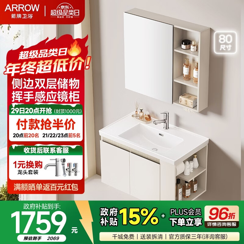 箭牌(ARROW)奶油风自由系列浴室柜组合卫生间卫浴洗漱台洗手洗脸盆陶瓷一体盆 自由3.0【经典款】+侧收纳80cm,30天发