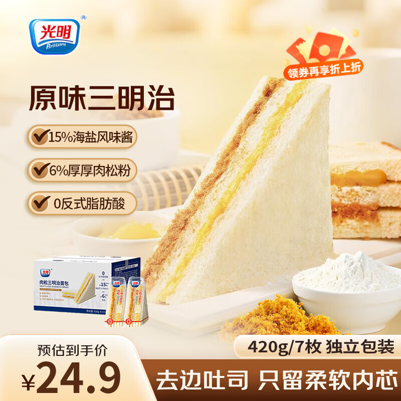 光明(Brilliant)肉松三明治吐司夹心面包早餐代餐儿童营养零食锁鲜吐司下午茶点心 原味肉松三明治*1箱 420g