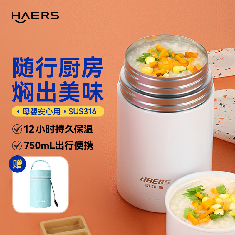 哈尔斯(HAERS) 焖烧杯316不锈钢焖烧壶焖烧罐闷烧保温饭盒便当带饭盒儿童成人 白色【配杯套+餐具】750ml