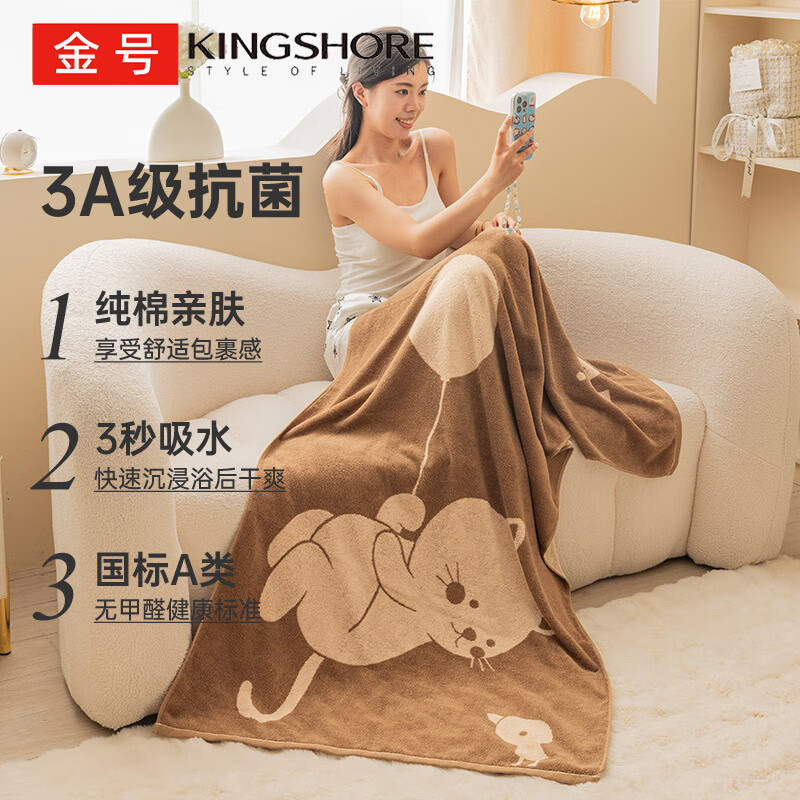 金号浴巾 180*80cm3A抗菌加厚加大洗澡巾 纯棉A类吸水卡通浴巾600g 棕