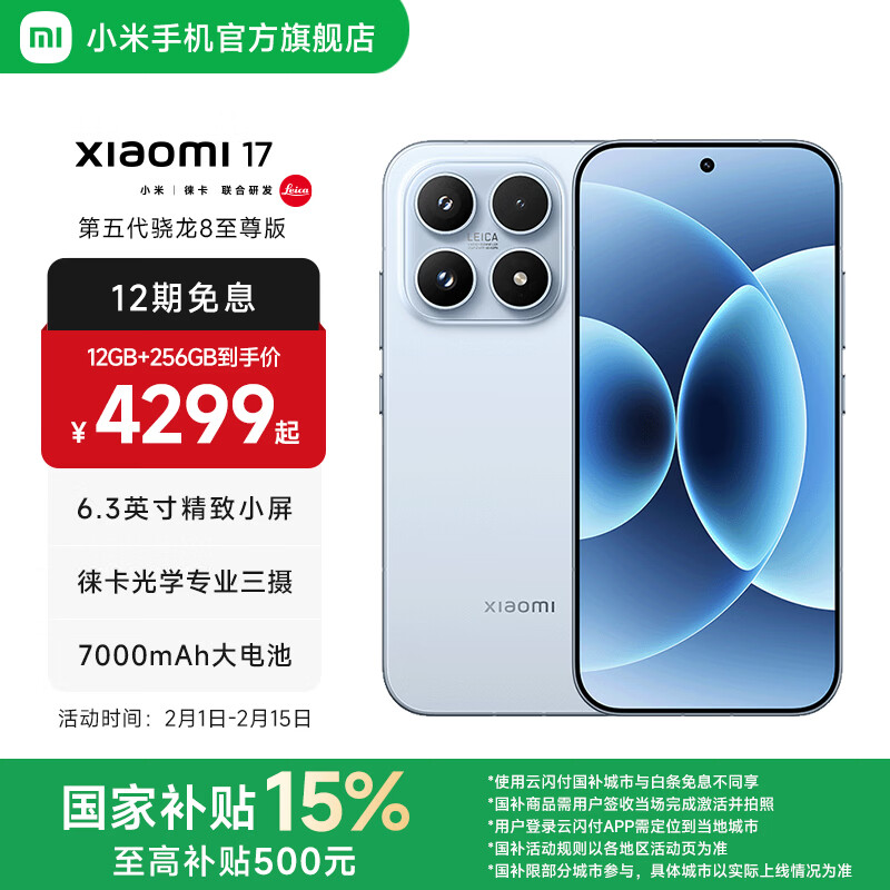 小米(MI)Xiaomi 17 旗舰影像小米手机 徕卡光学镜头大师人像 第五代骁龙8至尊版 超窄四等边 7000mAh大电池 冰融蓝 12GB+256GB