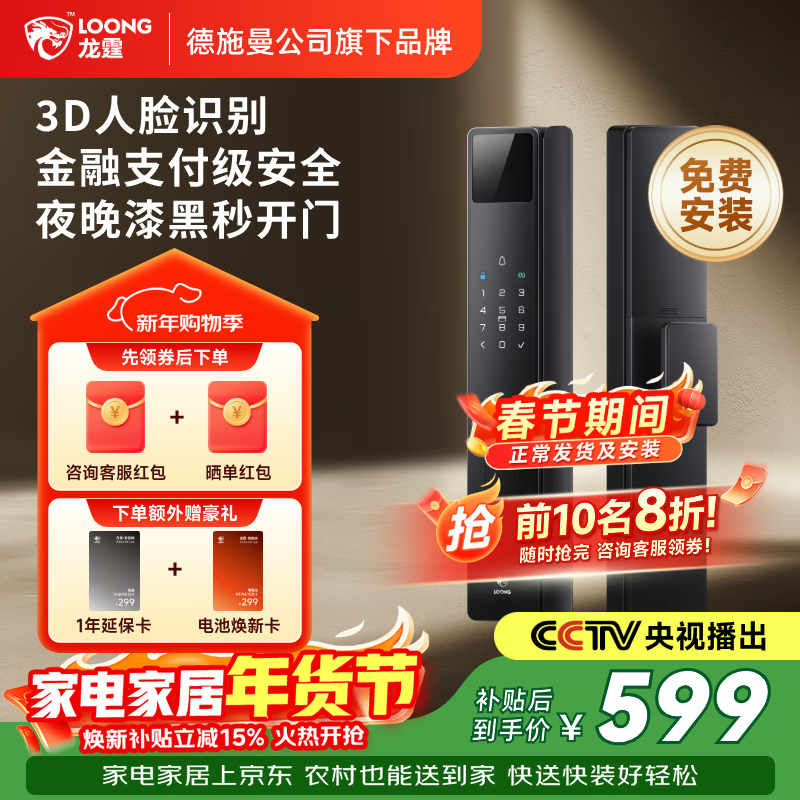 龙霆智能门锁人脸识别电子锁全自动指纹锁密码锁防盗门锁A3FD