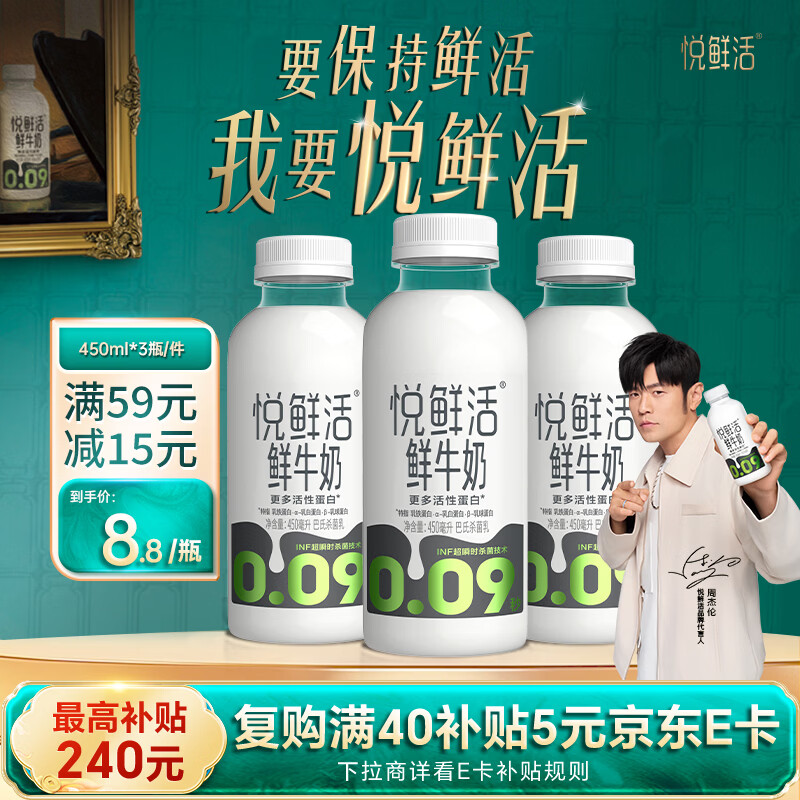 悦鲜活鲜牛奶 原生高钙鲜奶 450ml*3瓶 低温奶巴氏杀菌乳