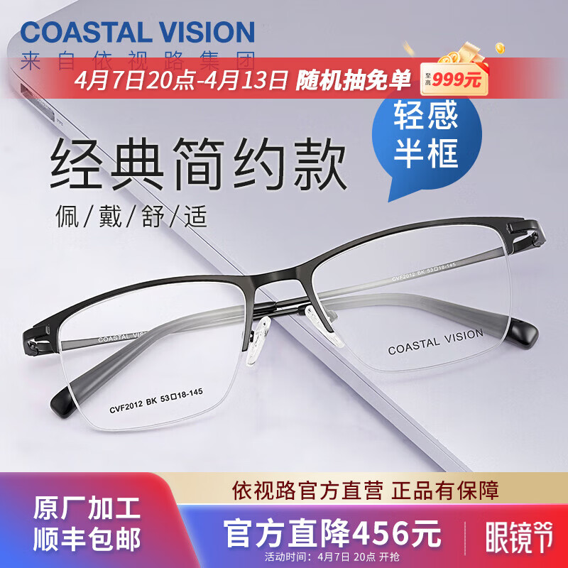 依视路(ESSILOR) 新款商务男镜架时尚镜框女配依视路镜片近视定制眼镜网上配镜 金属-半框-2012BK-黑色 镜框+依视路膜岩高清1.60现片