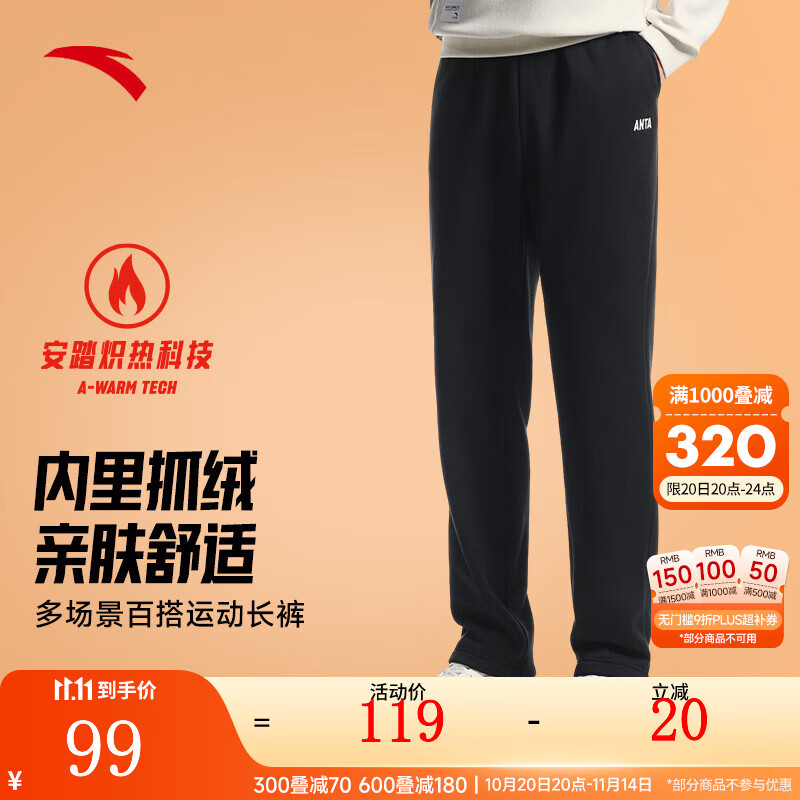 安踏男裤运动裤加绒男士秋冬季新款保暖直筒裤休闲卫裤跑步针织长裤子 【加绒款】基础黑-3 L (男175)