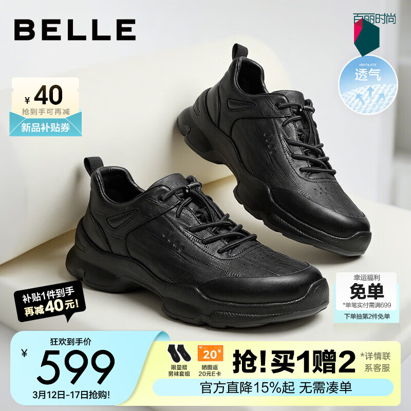 百丽厚底增高健步鞋男2026新款春季商场款时尚休闲运动鞋9AE01AM6预售 黑色 40 (250mm)