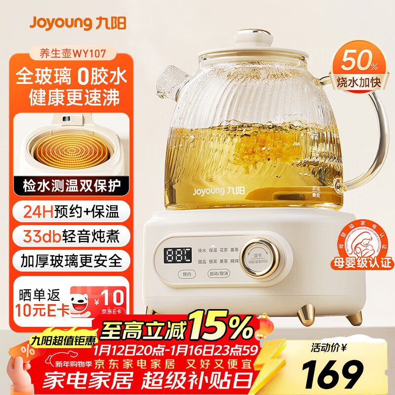 九阳(Joyoung)净萃全玻璃0胶水养生壶 办公室多功能煮茶器花茶壶 烧水壶恒温电热水壶 24h预约保温 1L WY107