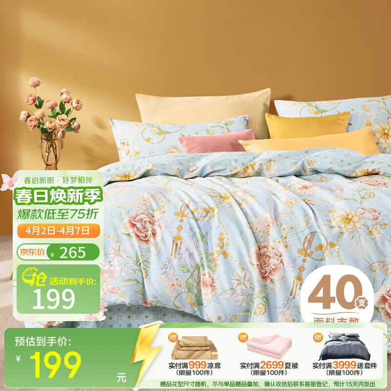 富安娜(FUANNA) 床上四件套纯棉被套床单枕套全棉四件套双人加大印花套件 【40支全棉 印花款】慕楠 1.2米 床单款 被套152*210cm 三件套