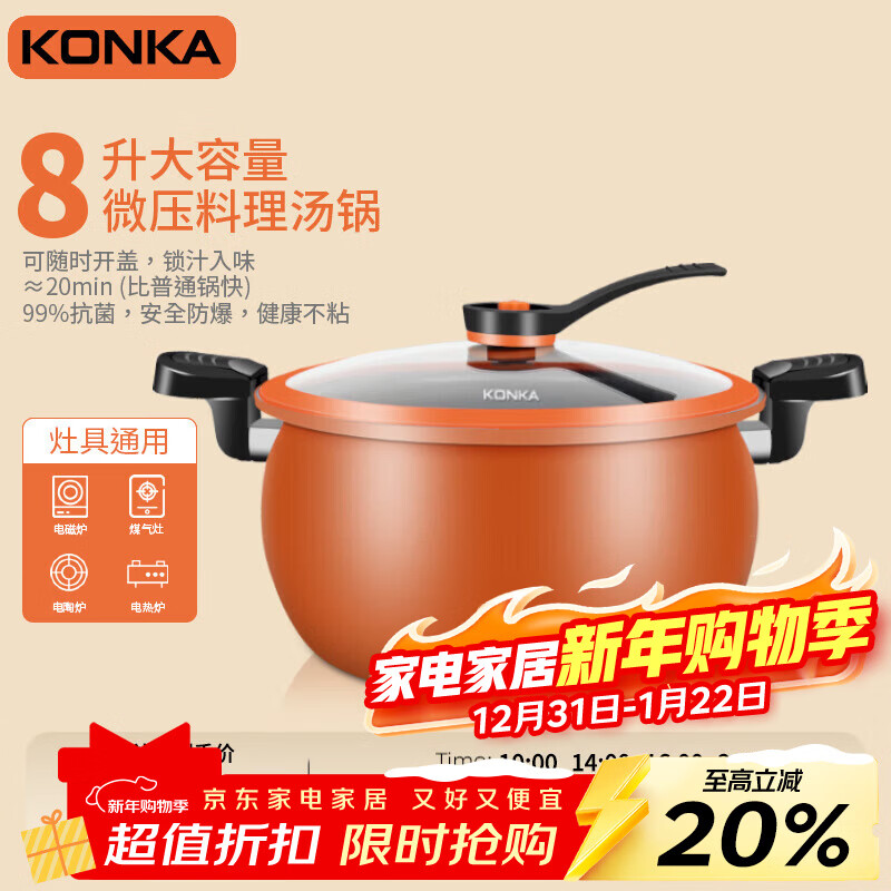 康佳(KONKA)煲汤锅微压料理锅压力锅家用大容量炖锅易洁不粘多功能煮锅磁炉锅 橙色 26cm 8L