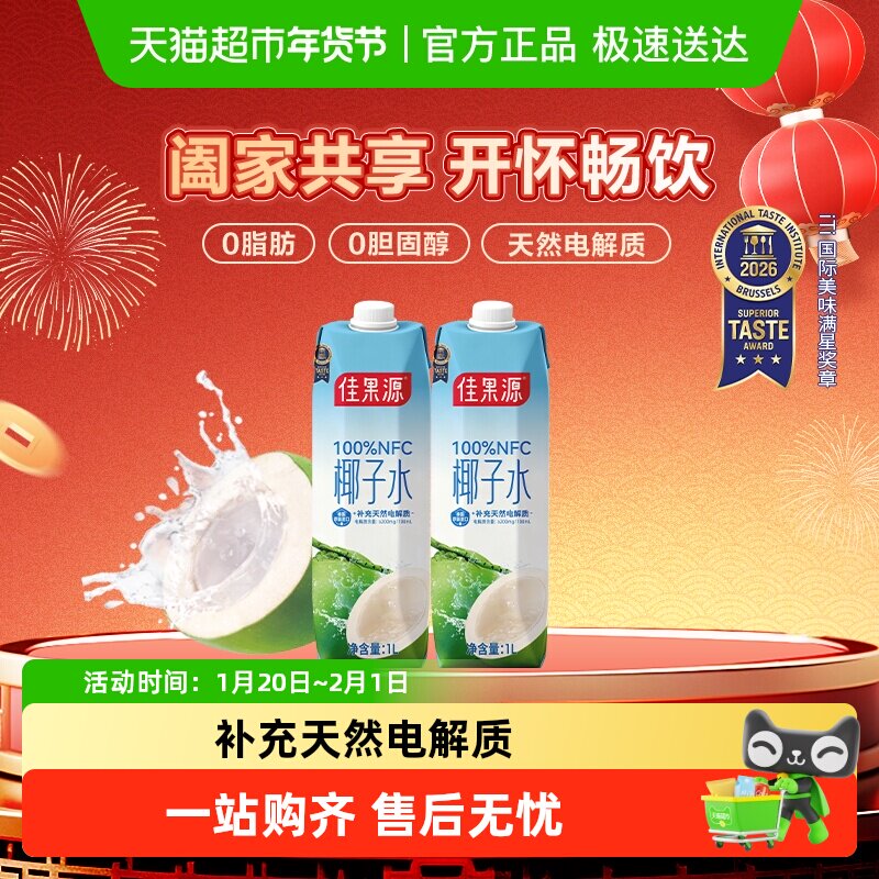 【王俊凯推荐】佳果源NFC泰国进口椰子水1L*2补充电解质饮料