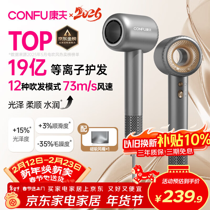康夫(CONFU)高速护发吹风机中空无叶家用大功率大风力速干等离子电吹风筒生日礼物 新年礼物送女友F9星灰