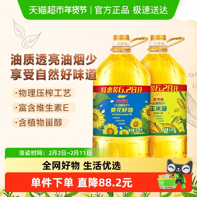 金龙鱼不油腻葵花籽油+玉米油6.28L*2食用油